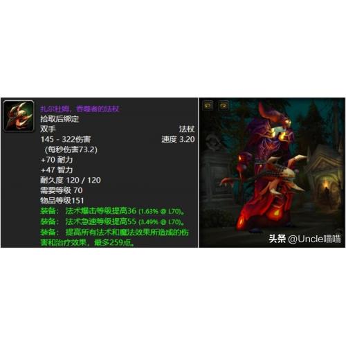 魔兽世界国际服燃烧的远征(扎尔杜姆吞噬者的法杖)属性:75 耐力62 智力法术伤害 113暴击