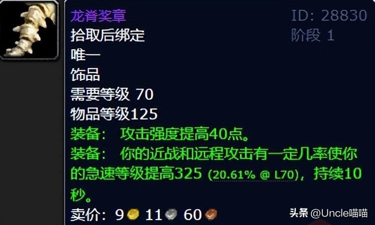 魔兽世界国际服燃烧的远征(龙脊奖章)属性:30 敏捷装备有几率提高急速等级325 点持续 10 秒狂暴战盗贼惩戒